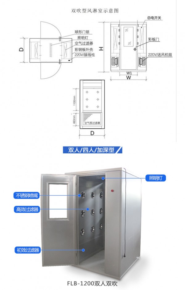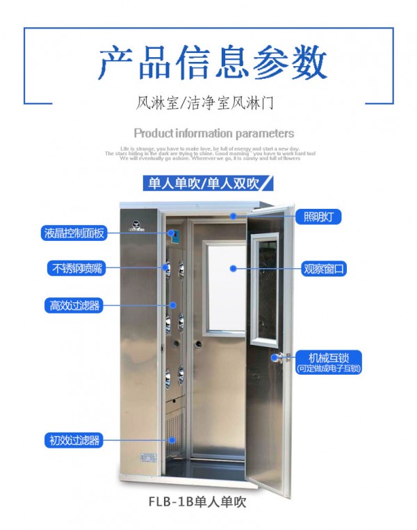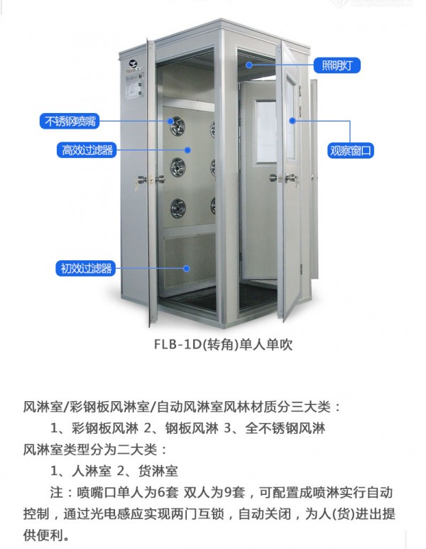 FLB系列风淋室产品是一种通用性较强的局部净化设备,安装于洁净室与非洁净室之间。当人与货物要进入洁净区时需经风淋室吹淋,其吹出的洁净空气可去除人与货物所携带的尘埃,能有效的阻断或减少尘源进入洁净区。